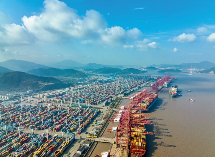 >> 两年多前,在宁波舟山港调研后不久,习近平总书记根据对新形势的思考,提出“构建以国内大循环为主体、国内国际双循环相互促进的新发展格局”。图为浙江宁波舟山港穿山港区。