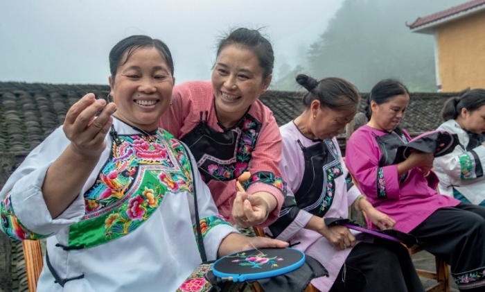 >> 2013年11月,习近平总书记在湖南湘西花垣县十八洞村考察时首次提出了“精准扶贫”,引领亿万人民打响一场伟大的反贫困斗争。图为十八洞村村民在讨论苗绣制作。