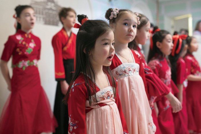 2019年2月2日,在俄罗斯莫斯科市郊的中共六大会址常设展览馆举办的新春联谊会上,中俄青少年合唱歌曲,共同庆祝中国农历新年。 新华社记者 白雪骐/摄