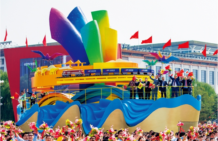 2019年10月1日上午,庆祝中华人民共和国成立70周年大会在北京天安门广场隆重举行。图为群众游行中的“人类命运共同体”方阵。彩车上,“一带一路”通古今,“友谊之桥”跨海陆,和平风帆共五洲。中国发展离不开世界,世界发展也需要中国。 视觉中国供图