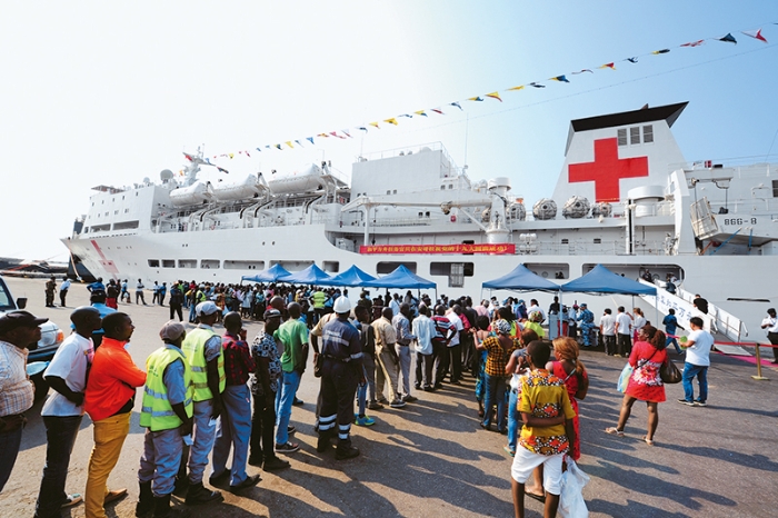 2017年10月,中国海军“和平方舟”号医院船抵达安哥拉罗安达码头,消息传开后数以千计当地民众涌上码头前来寻诊。 江山/摄