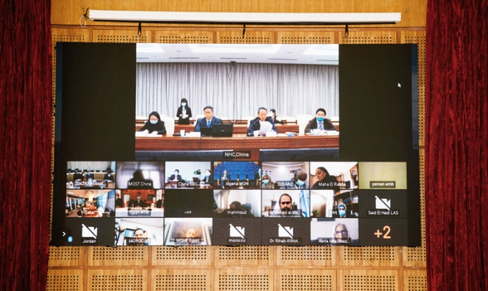 2020年4月9日,中国与阿拉伯国家联盟(阿盟)秘书处及阿盟成员国举行卫生专家视频会议,就抗击新冠肺炎疫情进行交流。中国外交部、卫健委、科技部、中国疾控中心等部门有关负责人和专家,阿盟社会事务助理秘书长海法、12个阿盟成员国主管官员和卫生专家,以及世卫组织应对新冠肺炎疫情特使共同参加了会议。图为在埃及首都开罗拍摄的视频会议现场。 新华社记者 邬惠我/摄