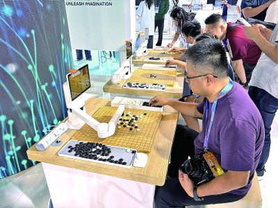 在科大讯飞展台,观众与机器人下围棋。蔺紫鸥摄/光明图片