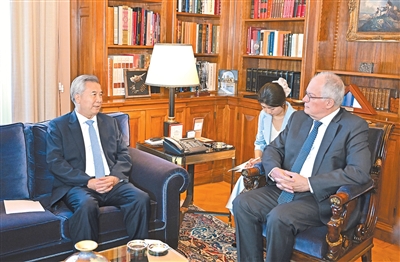 9月17日至20日,应希腊新民主党邀请,中共中央政治局常委、中央纪委书记李希率中共代表团对希腊进行正式友好访问。这是当地时间9月19日,李希在雅典会见希腊总统塔苏拉斯。