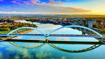 一列火车运行在匈塞铁路塞尔维亚境内贝诺段诺维萨德多瑙河大桥上。赵嘉政供图