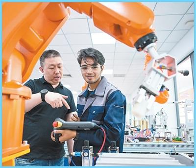在位于天津现代职业技术学院内的鲁班工坊,教师(左)指导学生操作设备。
