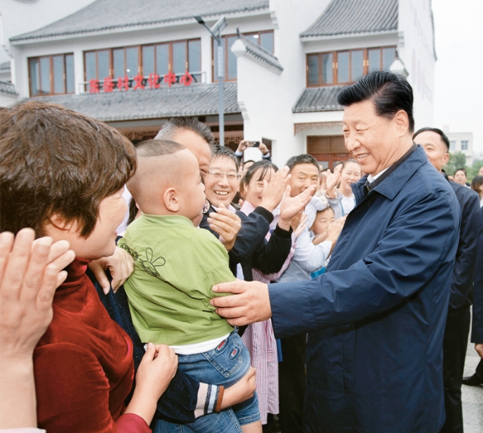 2019年9月16日至18日,中共中央总书记、国家主席、中央军委主席习近平在河南考察。这是17日上午,习近平在信阳市光山县文殊乡东岳村同乡亲们亲切交流,祝愿乡亲们生活芝麻开花节节高。 新华社记者 谢环驰/摄