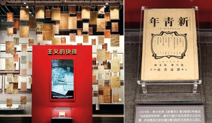 大型立体式视觉置景名为“主义的抉择”,100 件五四运动前后传播马克思主义、社会主义的报纸杂志,错落陈列在玻璃墙上。