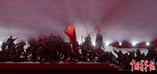 6月28日,北京国家体育场,庆祝中国共产党成立100周年文艺演出《伟大征程》现场,戏剧与舞蹈《长征》。中青报·中青网记者 陈剑/摄