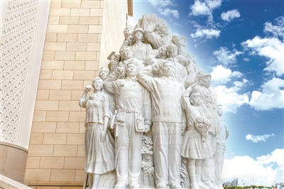 图为中国共产党历史展览馆主题雕塑作品《信仰》。这组群像雕塑以标志性的历史事件、人物和成就等为背景元素,形象再现了中国共产党员庄严宣誓的场景。 (图片来源:人民视觉)