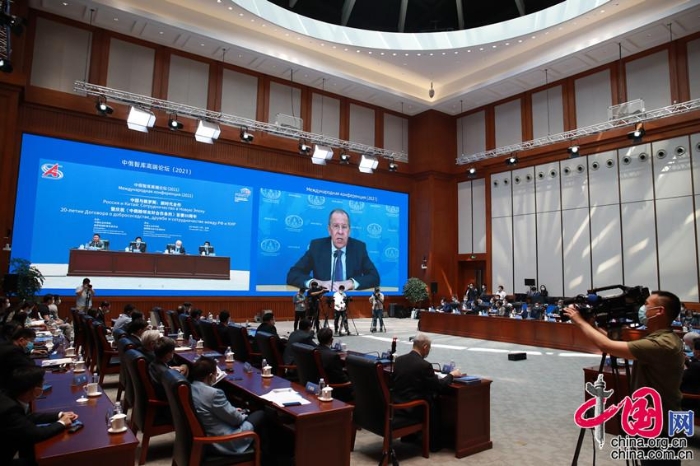 俄罗斯外长拉夫罗夫视频致辞。中国网记者 栗卫斌 摄