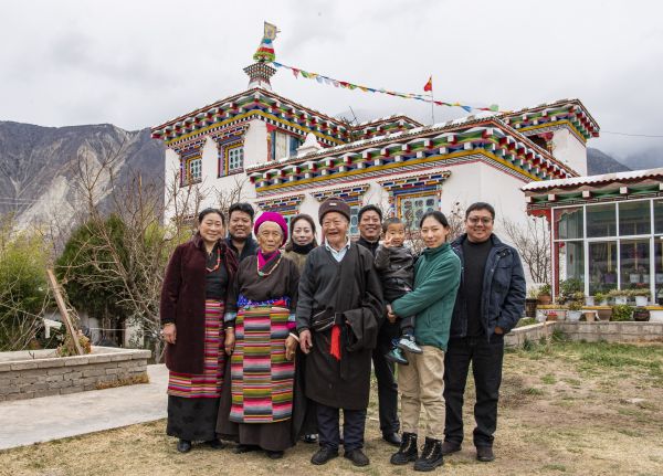 2月18日,在西藏昌都市芒康县盐井纳西民族乡,昂旺尼玛(中)和家人在家门前合影。昂旺尼玛曾出生在农奴家庭,生活贫苦,现在一家安居乐业。(孙非 摄)