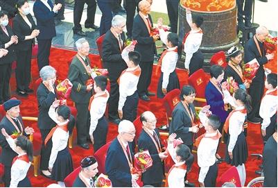 庆祝中国共产党成立100周年“七一勋章”颁授仪式在北京人民大会堂金色大厅隆重举行。图为少先队员向勋章获得者献花,敬礼致意。 新华社记者 高洁 摄