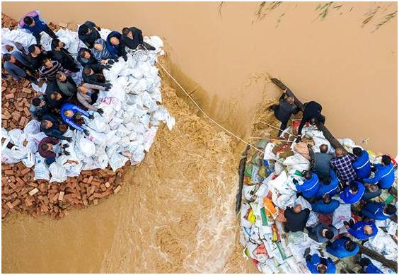 2021年10月,山西省稷山县纪检监察干部与人民群众合力加固临时堤坝。