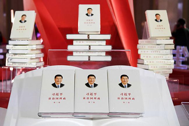 习近平新时代中国特色社会主义思想是当代中国马克思主义、二十一世纪马克思主义,是中华文化和中国精神的时代精华,实现了马克思主义中国化新的飞跃。图为《习近平谈治国理政》第三卷在上海书展展出。