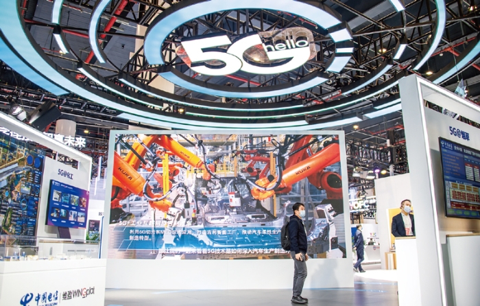 党的十八大以来,以习近平同志为核心的党中央把科技创新摆在国家发展全局的核心位置,作出战略谋划和系统部署。一大批重大创新成果竞相涌现,一些前沿领域开始进入并跑、领跑阶段,科技实力正在从量的积累迈向质的飞跃、从点的突破迈向系统能力提升,对促进经济社会发展、提高国家综合实力、满足人民日益增长的美好生活需要的支撑作用显著增强。图为2021年11月20日拍摄的中国光谷科技会展中心“5G+工业互联网成果展”现场。 新华社发 伍志尊/摄