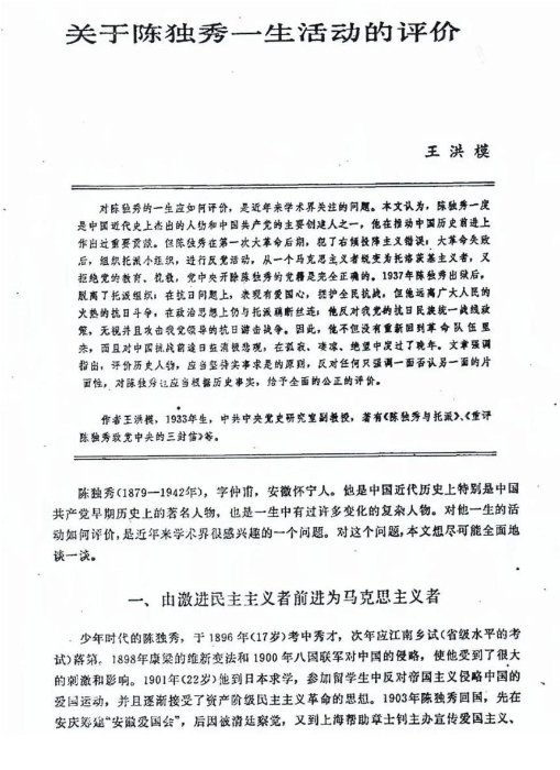 20世纪80年代初,陈独秀评价问题受到时任中共中央总书记胡耀邦的关注,由王洪模执笔并经中央党史研究室专家集体讨论完成了《关于陈独秀一生活动的评价》一文,对陈独秀一生的几个关键问题作出了明确的评述,即:陈独秀是五四运动的总司令,但不是一个好的马克思主义者;他是中国共产党的主要创建人之一和早期主要领导人,但不是一个称职的领导人;他从新文化运动到第一次大革命中期为革命作出了很大贡献,但在大革命的一些关键时刻犯了严重错误,并在后期犯了右倾投降主义错误,给党的事业造成严重危害等。该文对陈独秀的历史贡献和所犯错误都进行了分析和评价。受历史环境的影响,虽然有些评价仍有些偏颇,但是毕竟较前面的研究,向前迈进了一大步。