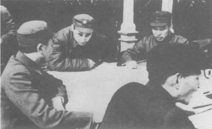 1946年,陈云出席中共中央东北局、东北民主联军总部在哈尔滨举行的高级干部会议,右起:陈云、彭真、林彪、刘亚楼