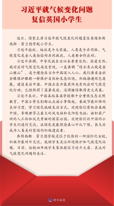 新华社北京4月21日电 近日,国家主席习近平就气候变化问题复信英国弗朗西斯·霍兰德学校小学生。