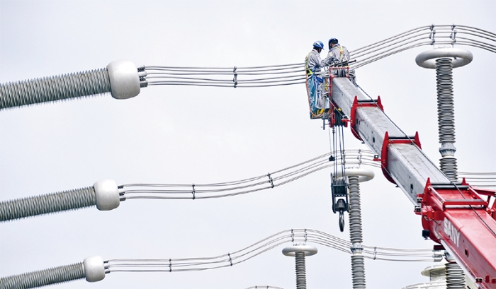 采取国产核心技术和关键设备的张北柔性直流电网是目前国内电压等级最高的柔性直流电网。2022年北京冬奥会期间,作为绿色电能输送主通道,确保了所有冬奥会场馆使用上百分之百的绿色电能。图为2021年9月25日,张北柔性直流电网延庆换流站员工在检查输变电设备。 新华社记者 李欣/摄
