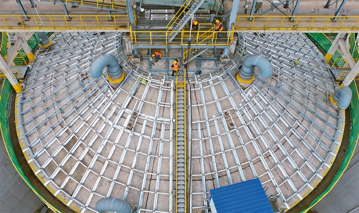 近年来,我国粮食仓储设施规模不断增加、功能显著提升、储备能力明显增强,总体达到世界较先进水平。图为2021年9月25日,工人在中储粮唐山直属库粮食仓储项目建设工地施工。 新华社记者 杨世尧/摄
