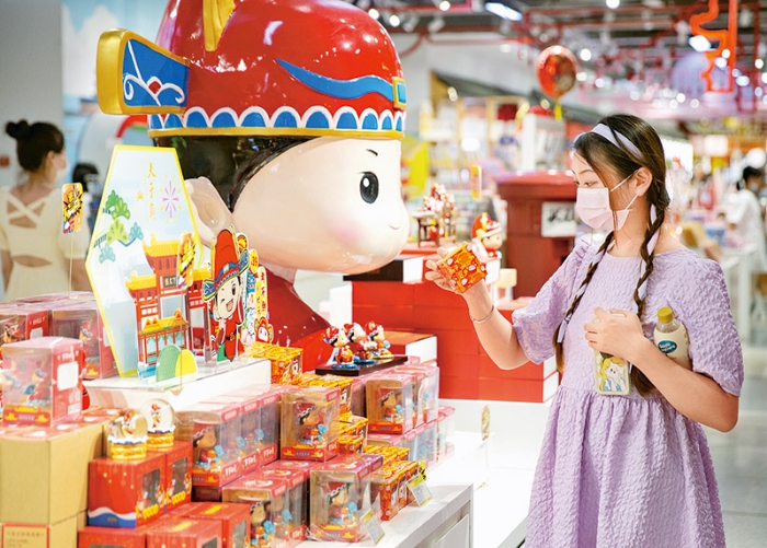 国家统计局发布数据显示,2021年我国全社会消费品零售总额超过44万亿元。随着经济规模不断攀升,我国逐步形成纵深广阔的强大国内市场。图为2021年10月5日,游客在南京夫子庙景区内的一家商店选购文创产品。 求是图片 苏阳/摄