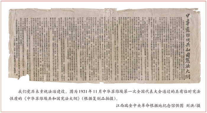 ——党始终注重依宪治国、依宪执政,宪法在治国理政中的地位和作用全面彰显。党始终高度重视宪法建设,从革命时期颁布中华苏维埃共和国宪法大纲、陕甘宁边区宪法原则,到新中国成立前夕通过的起临时宪法作用的中国人民政治协商会议共同纲领,这些探索和实践为新中国宪法制度发展积累了宝贵经验。从新中国第一部宪法“五四宪法”,到适应改革开放和社会主义现代化建设需要全面修改后施行的现行宪法,党通过制定实施宪法,有力推动和保障了党和国家事业发展。党的十八大以来,以习近平同志为核心的党中央强调依法治国首先是依宪治国、依法执政首先是依宪执政,设立国家宪法日,建立宪法宣誓制度,加强宪法实施监督,成立宪法监督专门机构,宪法在治国理政中的地位和作用达到前所未有高度。