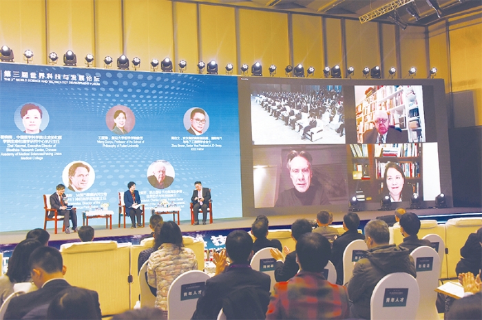 2021年11月6—7日,第三届世界科技与发展论坛在京举办。论坛以“开放·信任·合作”为主题,探讨全球科技创新、科技治理与科学文化,增进全球科技共同体互信合作,促进经济社会的可持续健康发展。图为中外专家线上线下围绕“科技伦理治理与信任合作”进行高端对话。 中新社发 孙自法/摄