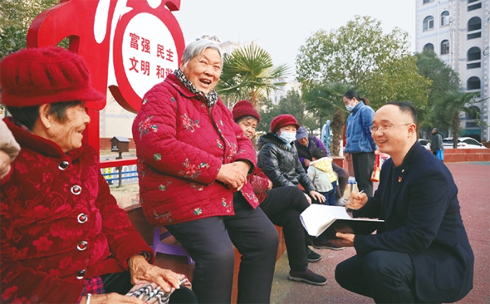 安徽省滁州市南谯区在村(社区)“两委”换届结束后第一时间开展“大走访、大调研、大整改”活动,全区87个村(社区)“两委”成员全覆盖走访基层群众,了解社情民意。图为2022年1月3日,南谯区银西社区党委负责人在向群众征求社区管理建议。 求是图片 董超/摄