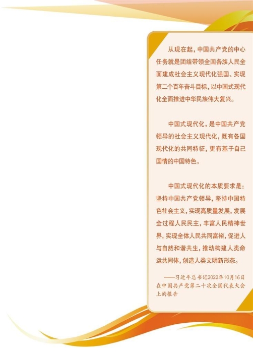 习近平总书记所作的党的二十大报告,进一步指明了党和国家事业的前进方向,是我们党团结带领全国各族人民在新时代新征程坚持和发展中国特色社会主义的政治宣言和行动纲领。党的二十大报告提出,中国式现代化,是中国共产党领导的社会主义现代化,既有各国现代化的共同特征,更有基于自己国情的中国特色。前进道路上,必须坚持和加强党的全面领导,坚持中国特色社会主义道路,坚持以人民为中心的发展思想,坚持深化改革开放,坚持发扬斗争精神,不断彰显中国特色社会主义制度优势,不断增强社会主义现代化建设的动力和活力,把我国制度优势更好转化为国家治理效能。这些重要论述表明,中国式现代化不是别的什么现代化,而是中国共产党领导的社会主义制度基础上的现代化。