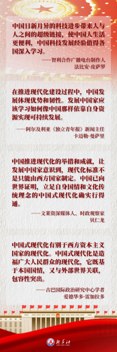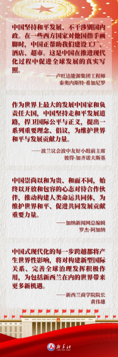 “中国式现代化对世界的现代化发展具有开创意义,”多次访华的文莱资深媒体人、时政观察家贝仁龙说,“中国推进现代化的举措和成就,让发展中国家意识到,现代化标准不是只能由西方国家制定。中国已向世界证明,立足自身国情和文化传统理念的中国式现代化确实行得通。”