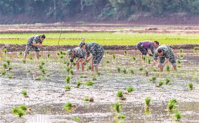 图为4月26日,重庆市南川区党员干部在帮助茶园村种粮大户插秧。 图片来源:视觉中国