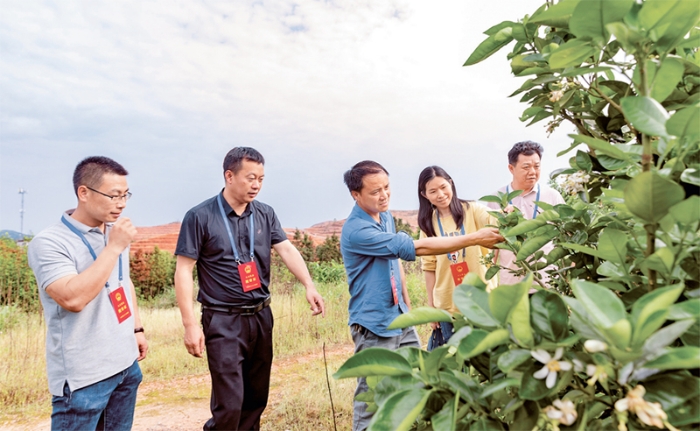 江西省吉安市吉水县白水镇人大充分发挥代表作用,组织各级人大代表实地调研井冈蜜柚产业发展情况,为壮大特色产业积极建言献策,助力乡村振兴。图为2023年4月20日,吉水县白水镇白水垦殖场二分场井冈蜜柚基地,人大代表在柚园实地调研井冈蜜柚产业发展情况。 求是图片 廖敏/摄