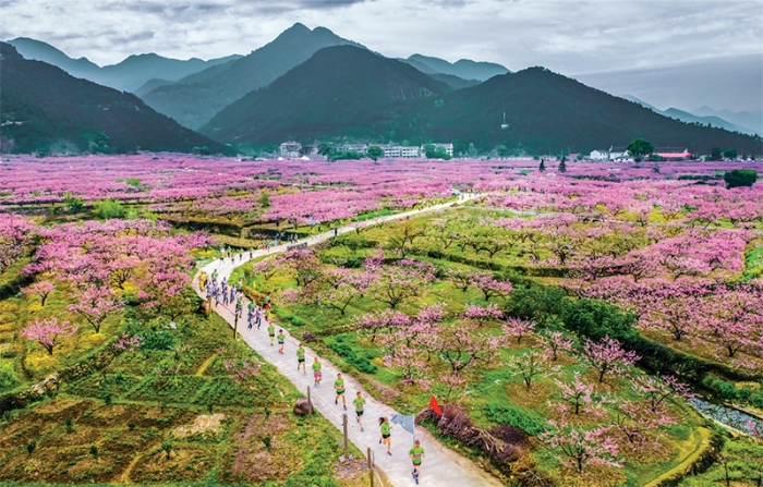 得益于“千万工程”,浙江省台州市临海市桃源村依托美丽乡村建设成果发展旅游产业,打造桃花源半程马拉松等特色文旅品牌,成为山清水秀、游客如织的赏花胜地,带领当地百姓走上农文旅融合的共富路。图为桃源村举办桃花源半程马拉松场景。 浙江日报社供图
