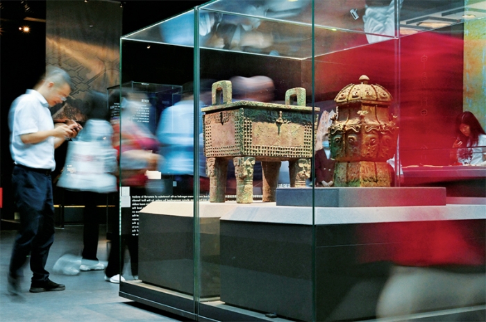 中国考古博物馆是中国历史研究院下设的国家级专业考古博物馆,以考古出土文物和珍贵古籍文献为依托,致力于展示与传播中华优秀传统文化。图为2023年9月15日,观众在馆内参观珍贵文物展品。 新华社记者 李贺/摄