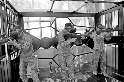 新疆军区某边防团官兵用VR模拟机训练。刘南松摄/光明图片