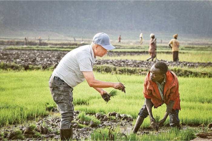 近年来,中非农业合作不断深化,中国农作物品种和农科技术正跨越山海,在非洲大陆生根发芽,把沃土变良田。图为2024年8月14日,在卢旺达南方省胡耶区的中国援卢旺达农业技术示范中心,中国水稻专家在稻田里指导当地稻农进行秧苗移栽。 新华社记者 韩旭/摄