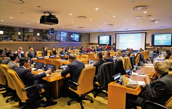 成立国际调解院是国际法治领域的创新之举,是推动全球治理变革完善的重要行动,充分彰显中国坚持以东方智慧为世界发展进步贡献公共产品的责任担当。图为当地时间2025年10月29日,中国常驻联合国代表团与国际调解院在联合国总部举办“国际调解院——完善全球治理法治新平台”主题边会,60多个国家和相关国际组织代表参加。 新华社记者 张凤国/摄