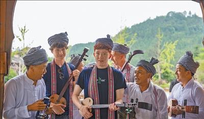 欧洲青年音乐人在贵州省从江县高增乡小黄村鼓楼参与侗族行歌坐月表演。